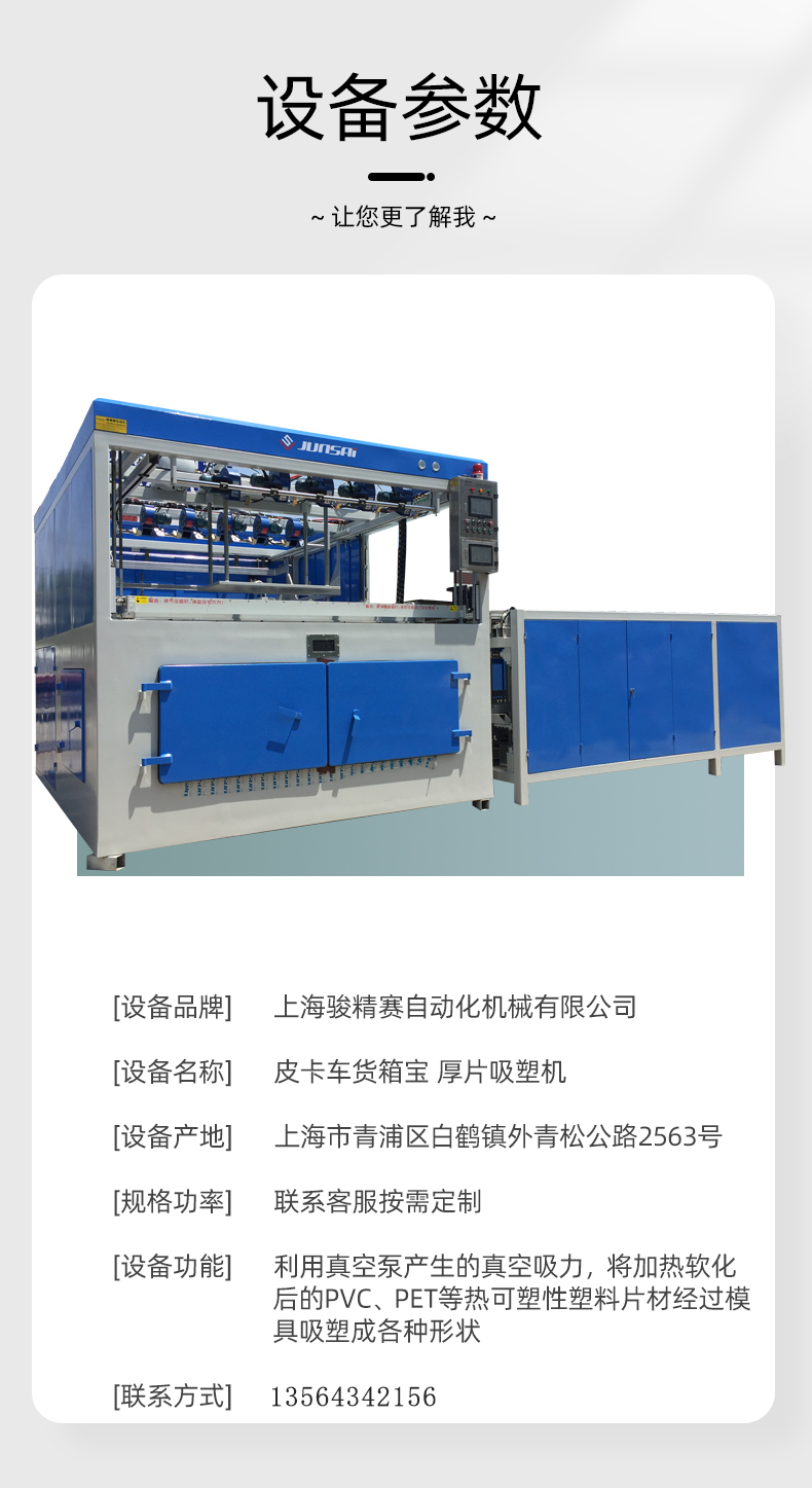 相關(guān)推薦 汽車通風(fēng)管全自動(dòng)雙層厚片吸塑機(jī) 江蘇駿精賽自動(dòng)上下料吸塑設(shè)備 皮卡車貨箱寶厚片吸塑機(jī) 潮汐苗床厚片吸塑機(jī) 種植養(yǎng)殖苗床厚片吸塑成型設(shè)備 廠家供應(yīng)咨詢客服可免費(fèi)試樣工藝